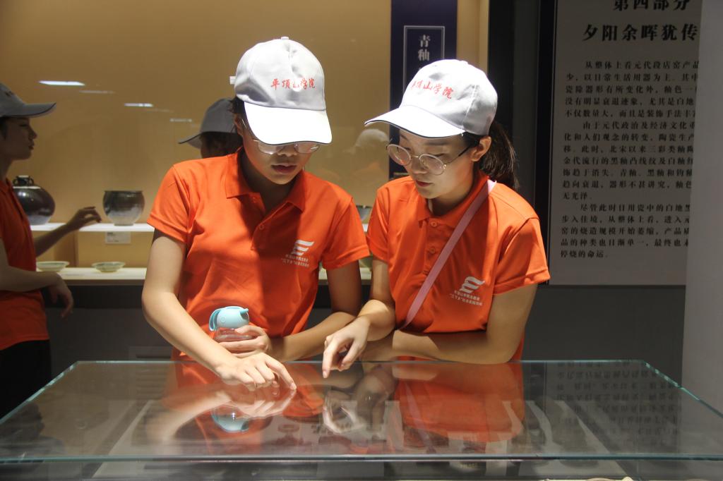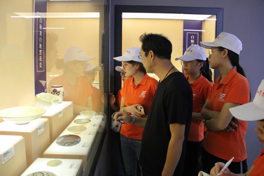 博物馆共分为上下两层,志愿者们首先来到下层进行参观。下层主要展出的是从唐朝到元朝的古陶瓷修复文物和文物标本,参观过程中,博物馆副馆长曾永生为志愿者们进行了详细的讲解,并针对志愿者们提出的问题一一进行解答。期间他带领大家回顾了鲁山花瓷的发展与演变,并按照年代的发展介绍了各个时期花瓷的特点。他说道,在鲁山花瓷没出现以前瓷器的釉色是南青北白的局面,是鲁山花瓷的出现打破了传统意义上的南青北白,使单色釉变成了双色釉,北宋时期,又出现了珍珠底刻划花工艺,丰富了花瓷的装饰纹样,彰显了这一时期花瓷制造工艺的最高水平。