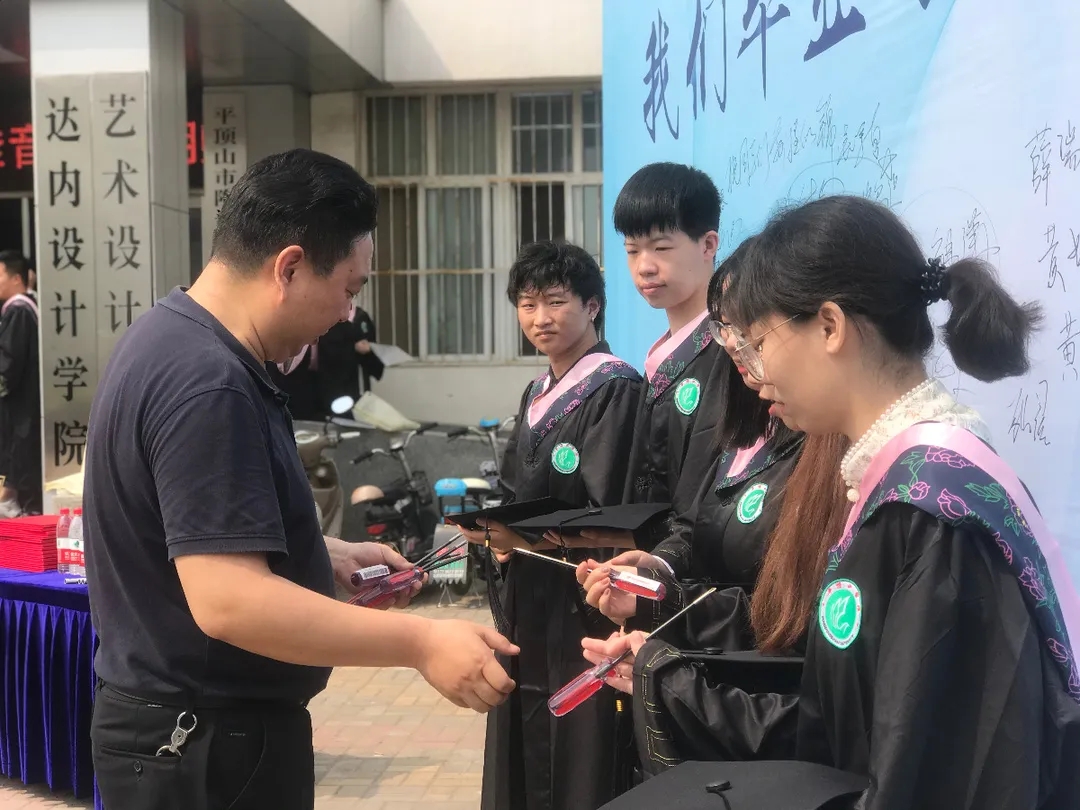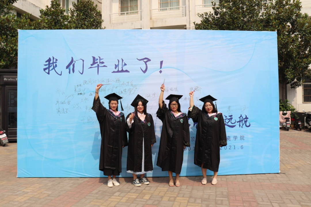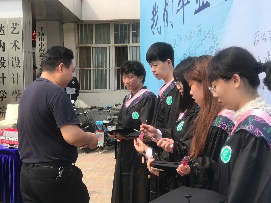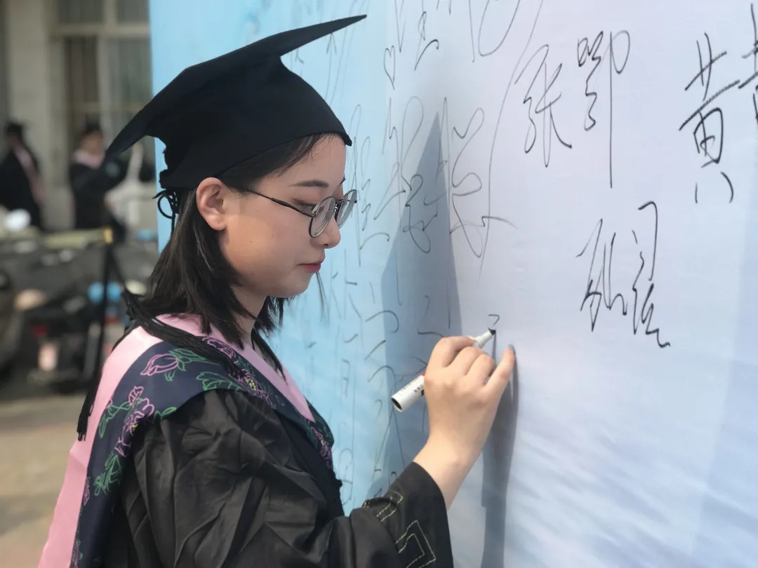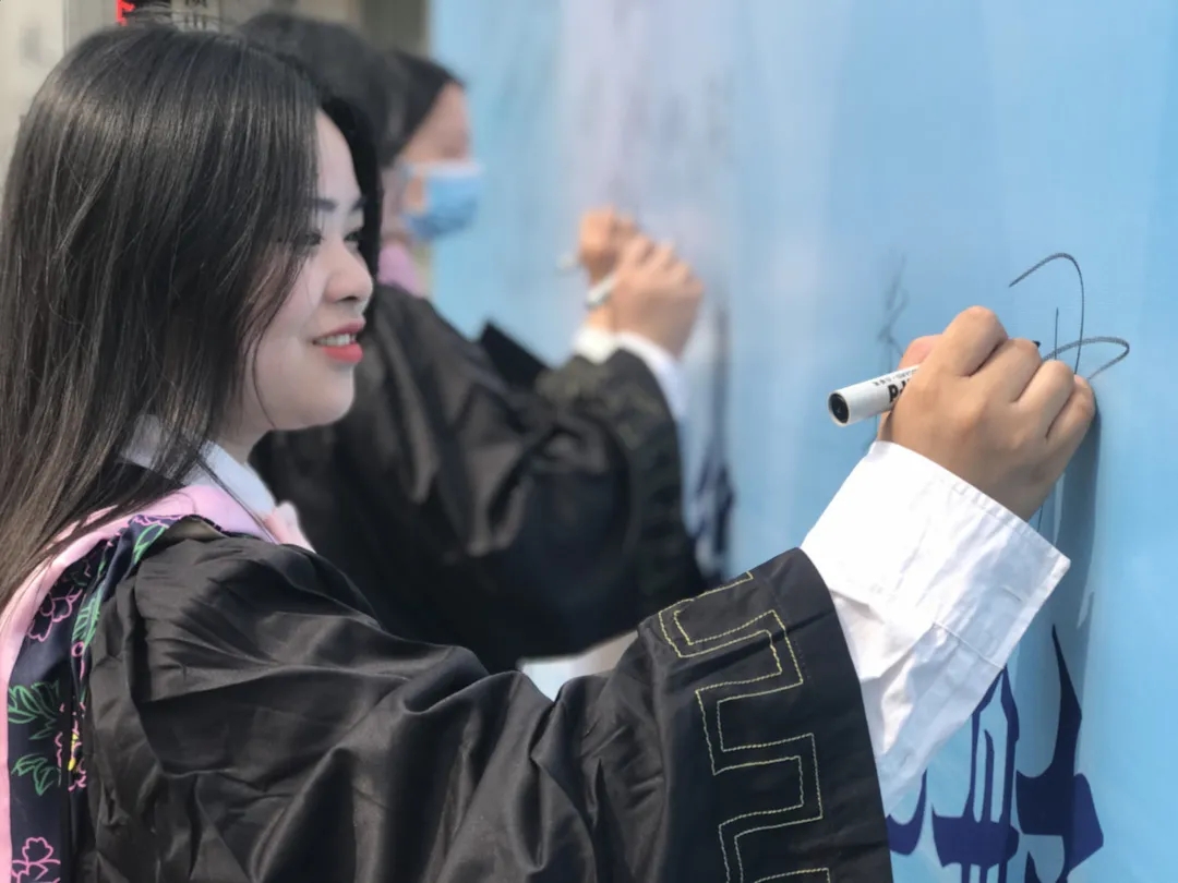 上午九点半,毕业生们陆续抵达会场,依次与老师们在背景墙前合影留念,写下青春的祝愿。