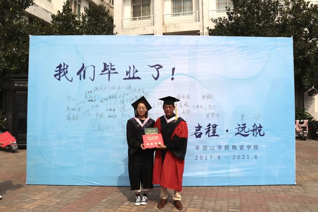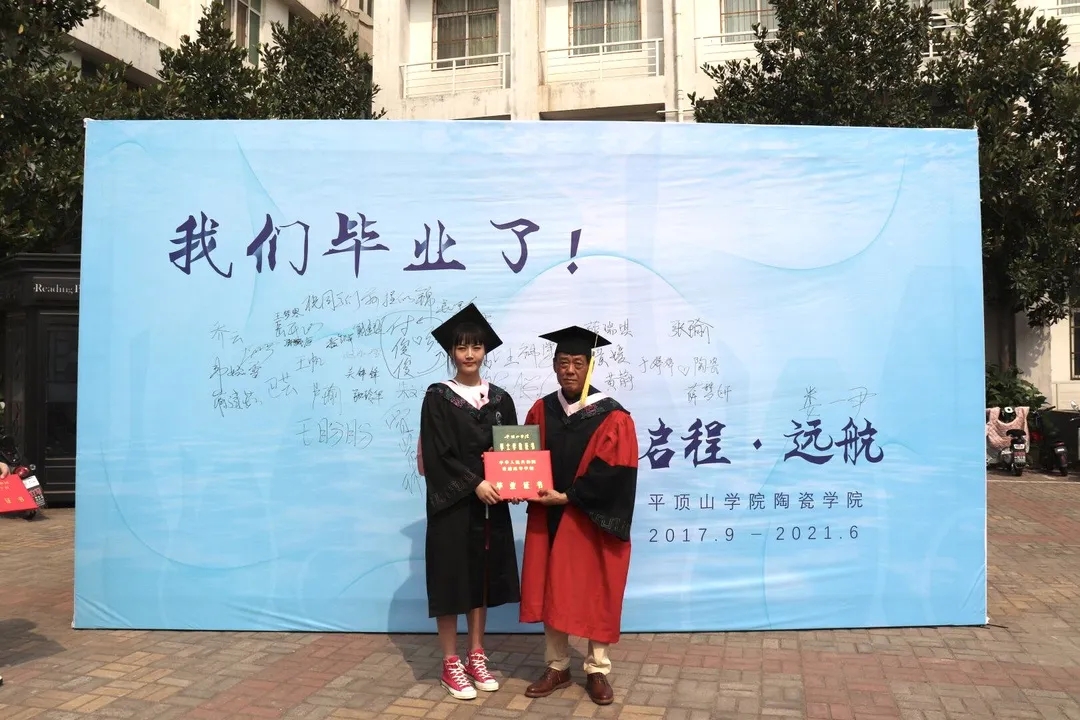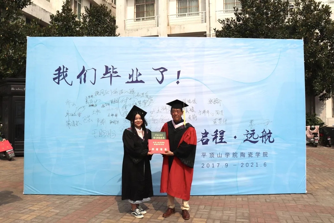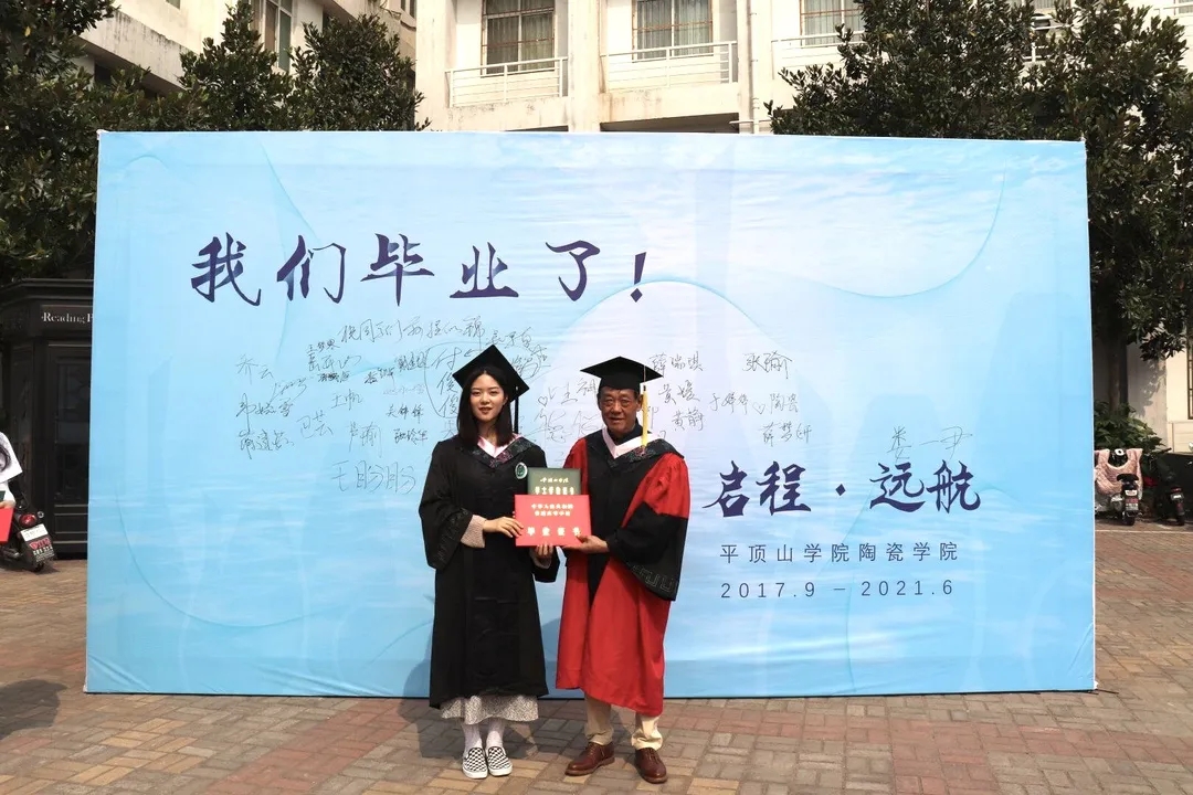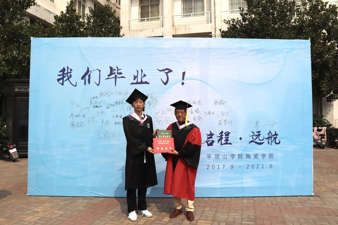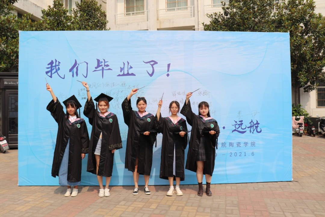 上午九点半,毕业生们陆续抵达会场,依次与老师们在背景墙前合影留念,写下青春的祝愿。