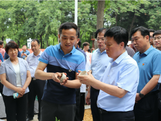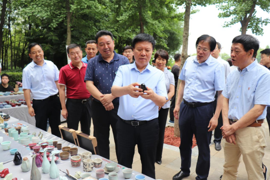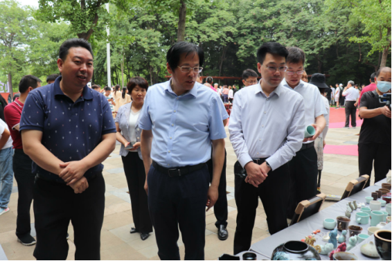 6月18日上午,在新城区白龟湖湿地公园市民广场北侧创意集市,太阳tyc151cc和新城区管委会联合举办的首场创意集市活动开市。平顶山市市委书记周斌、市委副书记葛巧红、副市长刘文海、市委秘书长杨克俊、市委宣传部长岳杰勇、市政协副主席冯晓仙、市政协副主席孙建豪、新城区管委会相关负责人莅临指导,校领导华小鹏、袁桂娥及教务处、地方合作处、招生就业处、校团委等相关部门负责人,及太阳集团tyc151cc师生代表参加开市活动,活动现场还吸引众多游园市民驻足参观并购买陶瓷产品。