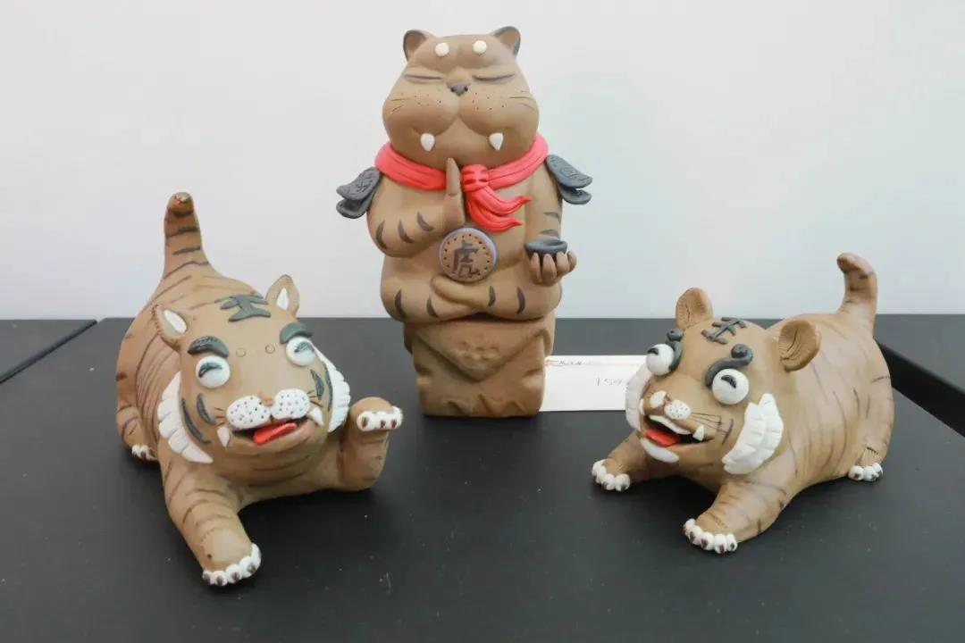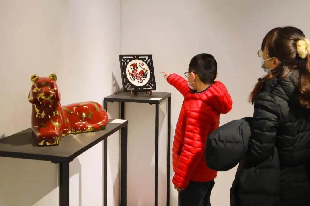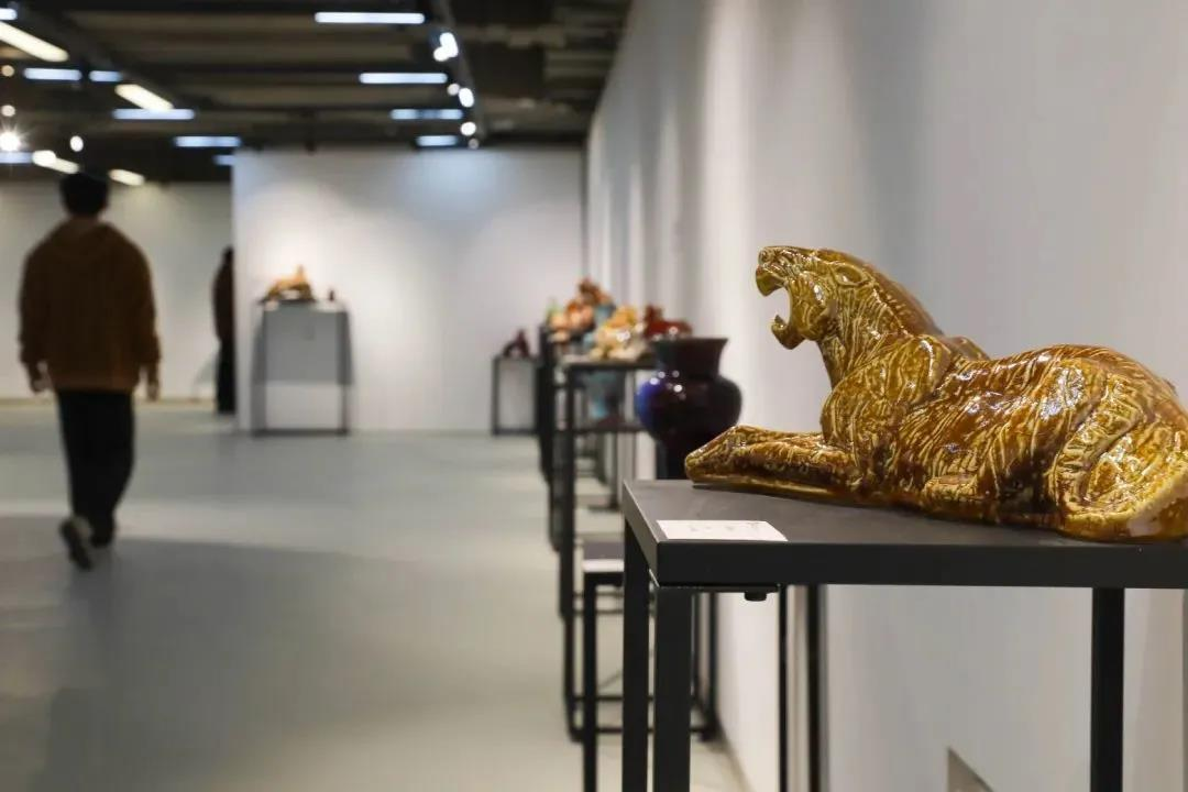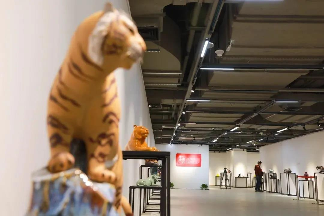 浦东群艺馆新馆展厅位于河西地下一层,与大剧场比邻。而在馆外,“虎虎生风”的展览旌旗迎风招展,吸引观众入内。走进展厅,便进入了由陶瓷打造的“百虎争霸”的世界。其中既有勇往直前的猛虎,也有静观万物的王者之虎;既有俏皮可爱的萌萌虎,亦有前卫拟人的思想虎……不同时代背景下,不同创作者采用不同艺术手法去描摹、勾勒、雕刻、塑造出的陶瓷艺术生肖作品,令人目不暇接。