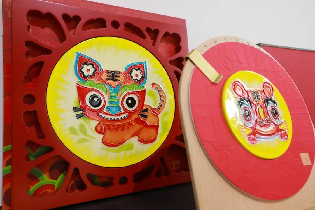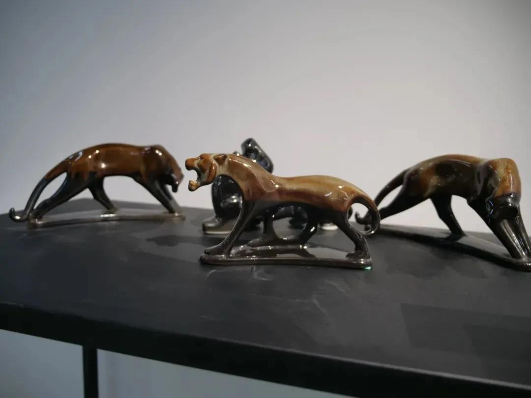第一展区“寅虎回首”,寓意回首过去取得的成就,集中展示了古代以及国营瓷厂集体创作时期精湛的陶瓷生肖作品。上迄唐代十二生肖陶俑,下至上世纪80年代韩美林设计的“美林虎”,此时期虎的形象更接近其天然的野性,在造型上注重塑造虎挺拔的身姿、富有张力的肌肉以及运动的动感;在装饰上,注重釉色营造自然流淌、交融后的写实感,富有意境的肌理、目光炯炯的表情都烘托了虎的生猛、果敢,也展示了当时精益求精的工匠精神。