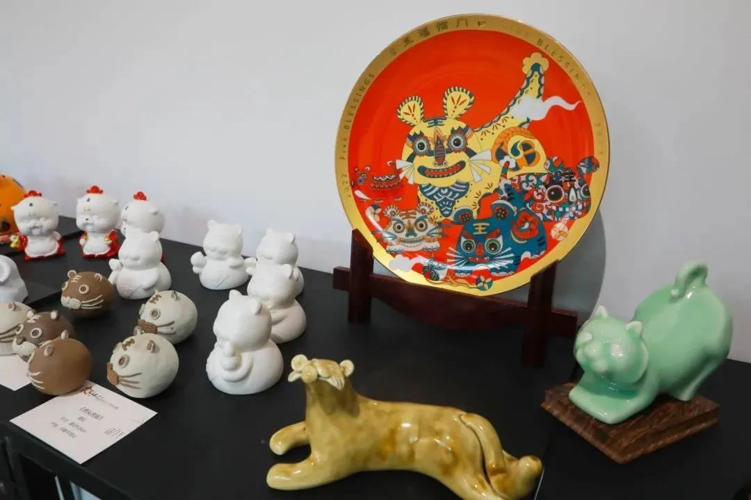 “威虎上山”寓意传统与现代过渡时期,展区内的生肖虎作品趋于做工的精致,造型、釉色的简练,但品类更为丰富,虎的形象开始趋于温和、敦厚,身形开始追求饱满、圆润,拉近了与观者在情感上的距离。“稚虎潜行”寓意当下文化创意设计时期,此区域作品具有拟人化、趣味性等特征,虎的表情与形态变得前所未有的丰富。