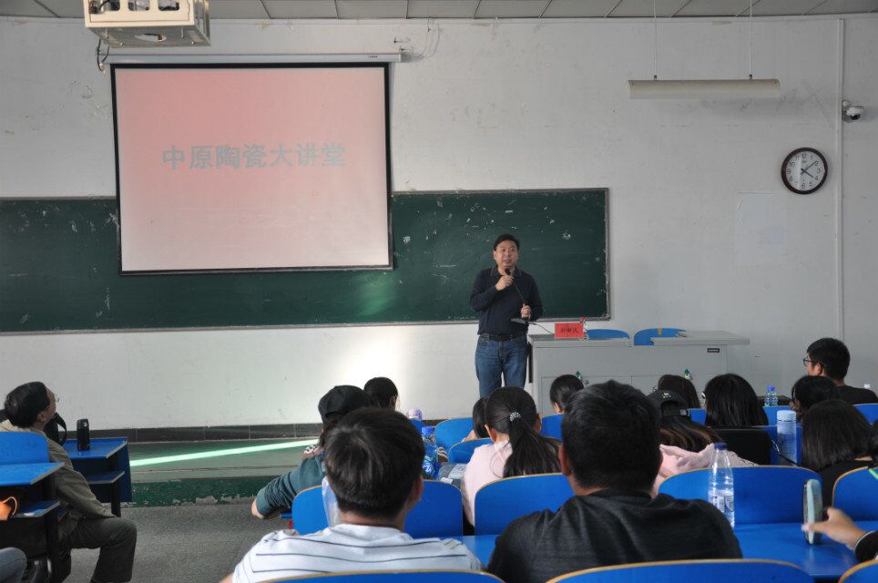 首先,孙教授采用幻灯片的形式详细地讲述了汝窑的发展历程。汝窑是史料记述丰富但传世品最少的一座名窑,因烧制纯正的天青釉瓷器而闻名天下,自北宋晚期问世以来备受人们的推崇和喜爱。汝窑位居宋代“汝、官、哥、钧、定”五大名窑之首,在中国陶瓷史上素有“汝窑为魁”之称。其次,孙新民教授通过图片、文献等材料向同学们展示了汝窑瓷器的烧制工艺及原理,使同学们深刻感受到汝瓷的魅力。此外,孙教授用专业的术语介绍了汝瓷的造型、釉色和支钉支烧工艺,并展示了宝丰清凉寺窑址出土的青瓷印花盘、青瓷执壶、黑瓷盏、三彩贴花炉等瓷器,用丰富的实物例证深入浅出地诠释了闻名中外的汝瓷之美及汝窑的演变与发展,用生动的历史知识讲述了汝瓷的研究和恢复史,并结合自身的工作历程介绍了汝瓷的欣赏价值与使用价值。
