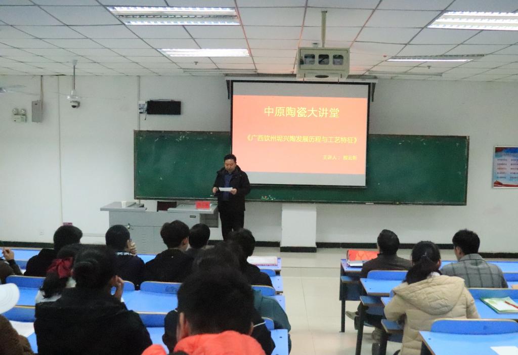 仪式结束后,熊云新教授在图书馆L311教室作了一场题为《广西钦州坭兴陶发展历程与工艺特征》的学术报告。熊教授在回顾坭兴陶的发展历史脉络中,向同学们讲解了新中国时期和新时代时期的坭兴陶大师及行业发展情况。接着, 熊云新教授向同学们介绍了坭兴陶的传统制作工艺流程, 他讲到,坭兴陶的烧成工艺结合了缓烧、平烧、快烧三种烧成技法,在烧成过程中严格把控升温曲线、烧成温度以及烧成气氛。最后,熊教授从坭兴陶双料混炼、骨肉相融、柴窑素烧、陶刻纹印、民族造型及窑变陶彩六方面的工艺特征向同学们作进一步说明, 并向同学们展示了个人的部分代表作品。
